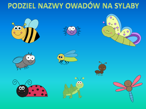Nazwij owady i podziel nazwy na sylaby. Powiedz , które z owadów fruwa? Który ma czarne kropki? Który plecie sieć? Który wytwarza miód?