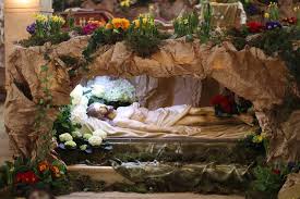 Posłuchajcie: Wielki Piątek to dzień drogi krzyżowej i śmierci Pana Jezusa. Pismo Święte przekazuje nam, że dobrzy ludzie zdjęli Jego martwe ciało z krzyża, owinęli je płótnem i złożyli do grobu wykutego w skale, przed którym żołnierze kazali umieścić duży kamień. Zrobili to z obawy, że ktoś po kryjomu zabierze ciało Pana Jezusa. Pan Jezus przebywał w grobie trzy dni. Po trzech dniach stało się coś nadzwyczajnego: Pan Jezus powstał z grobu! Zwyciężył śmierć i nigdy już nie umrze. Zaraz po Wielkim Piątku przychodzi Wielka Sobota. Wtedy w kościołach urządzane są na tę pamiątkę „groby Pana Jezusa”. Przypominają nam one ten prawdziwy grób, do którego Pan Jezus został złożony po swojej męce. Znajduje się w nich zawsze figura przedstawiająca martwe ciało Pana Jezusa.
