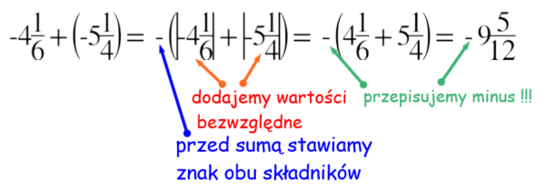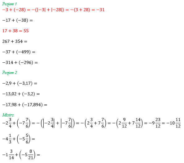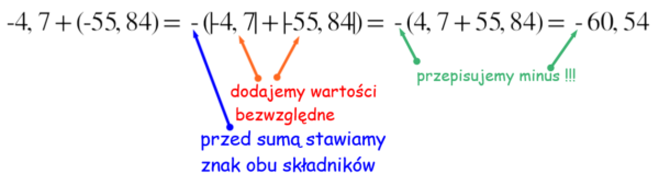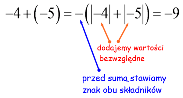 Aby dodać dwie liczby o tych samych znakach należy dodać ich wartości bezwzględne, a przed sumą postawić znak obu składników.