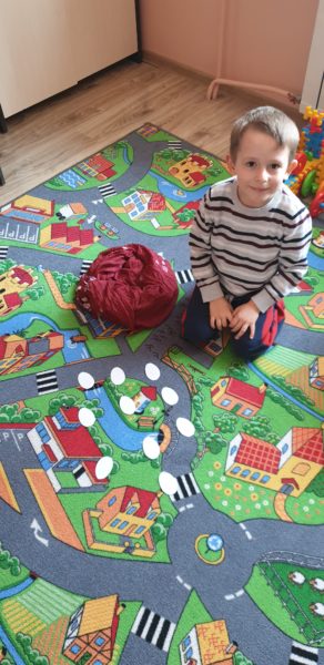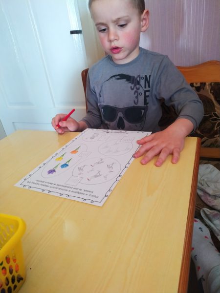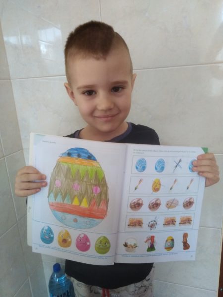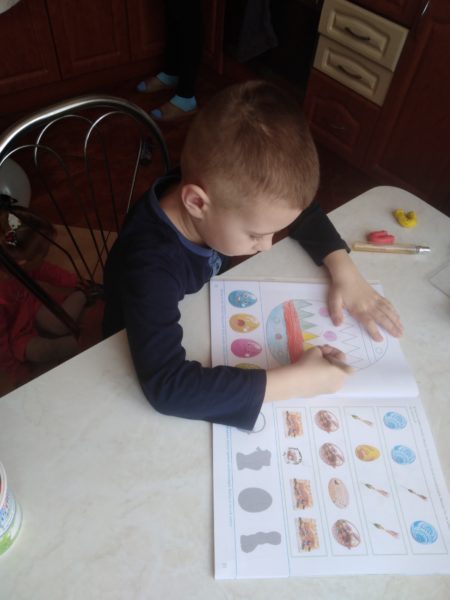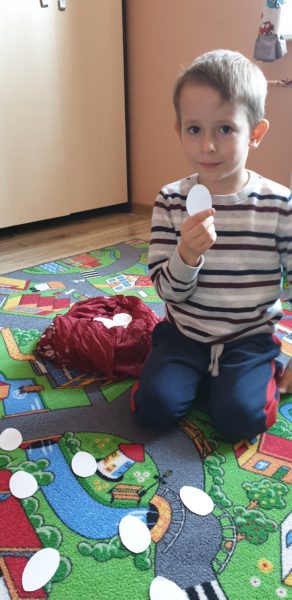 Podkładka dla dziecka, plastelina w różnych kolorach lub masa solna . Dziecko lepi z plasteliny ptasie gniazdka z jajeczkami: ugniatając plastelinę, spłaszczając ją i ponowne ugniata. Następnie formuje kulki różnej wielkości i w różnych kolorach. Na koniec wykonuje gniazdka i umieszcza w nich wykonane jajeczka. Mówi, ile jajeczek znajduje się w gniazdkach.