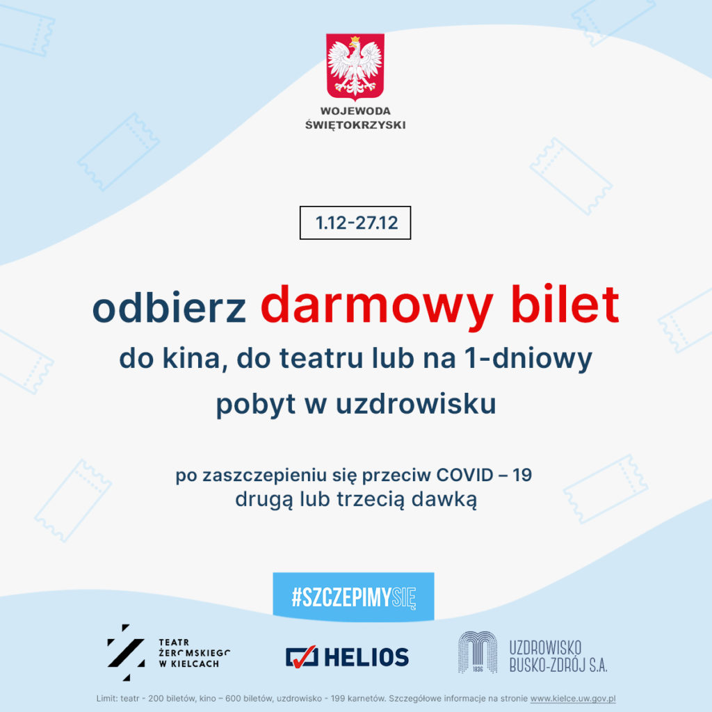 Wojewoda Świętokrzyski Zbigniew Koniusz, w ramach akcji informacyjno-promocyjnej zachęcającej mieszkańców województwa świętokrzyskiego do szczepień przeciw COVID-19, uruchomił kampanię polegającą na możliwości skorzystania przez osoby, które w dniach od 1 do 27 grudnia 2021 przyjmą drugą lub trzecią dawkę szczepionki przeciwko COVID-19 z bezpłatnych biletów na: