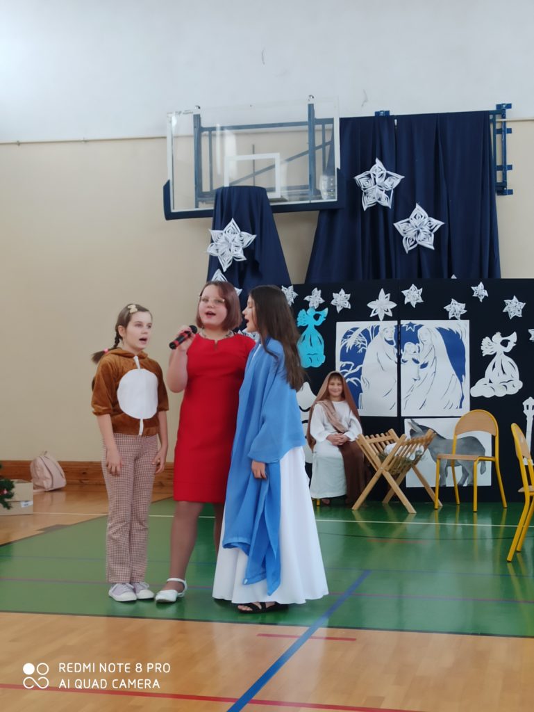 Za nami Święta Bożego Narodzenia, wspomnienia rodzinnych, ciepłych przeżyć. 21.XII.2022r. w świątecznej scenerii grudniowych dni udzieliła się nam wyjątkowa atmosfera podczas inscenizacji wigilijnych jasełek. Uroczystą , przedświąteczną akademię rozpoczął pan dyrektor mgr. Tadeusz Opala wigilijnym przesłaniem i życzeniami dla całej społeczności szkolnej. Ksiądz proboszcz Sławomir Machowski modlitwą wprowadził nas w duchowy wymiar biblijnych scen Bożego Narodzenia. Młodzi aktorzy zaprezentowali bożonarodzeniowy spektakl , w którym pojawiły się scenki z przygotowań do Wigilii, Świąt przeplatane scenkami biblijnymi. Polska tradycja świętowania pokazuje symbolikę ; Wigilii, łamanie opłatkiem, puste nakrycie do stołu, narodziny Jezusa., dom, rodzinę. Taniec śnieżnobiałych aniołków , śpiew kolęd i pastorałek, muzyka ilustracyjna, życzenia, dodały przedstawieniu uroku i klimatu, podkreśliły talent młodych artystów , poczuliśmy magię nadchodzących świąt. Pokazanie wielopokoleniowej hierarchii rodziny postaci ; babci i dziadka ma charakter wychowawczy; przekazuje mądrość oraz ponadczasowe wartości wnukom -szacunek dla starszych .Tradycji staje się zadość; rodzina odwiedza stajenkę, spotyka Maryję , Józefa, narodzonego Jezusa . Melodia ,Wśród nocnej ciszy” popłynęła na strunach ukulele w wykonaniu najmłodszej uczestniczki naszego przedstawienia Blanki Mazur z kl. I a. Zabawny motyw konfliktu między Psem i Kotem wyjaśnia odwieczną istotę wrogości ,a jednocześnie pojednanie i przebaczenie w tym wyjątkowym czasie.