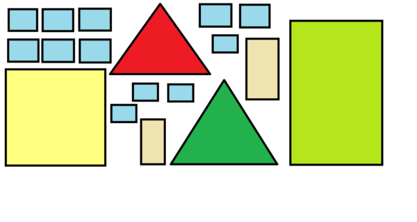 Papierowe kolorowe figury geometryczne: duży prostokąt, mały prostokąt, 2 małe kwadraty, duży trójkąt.