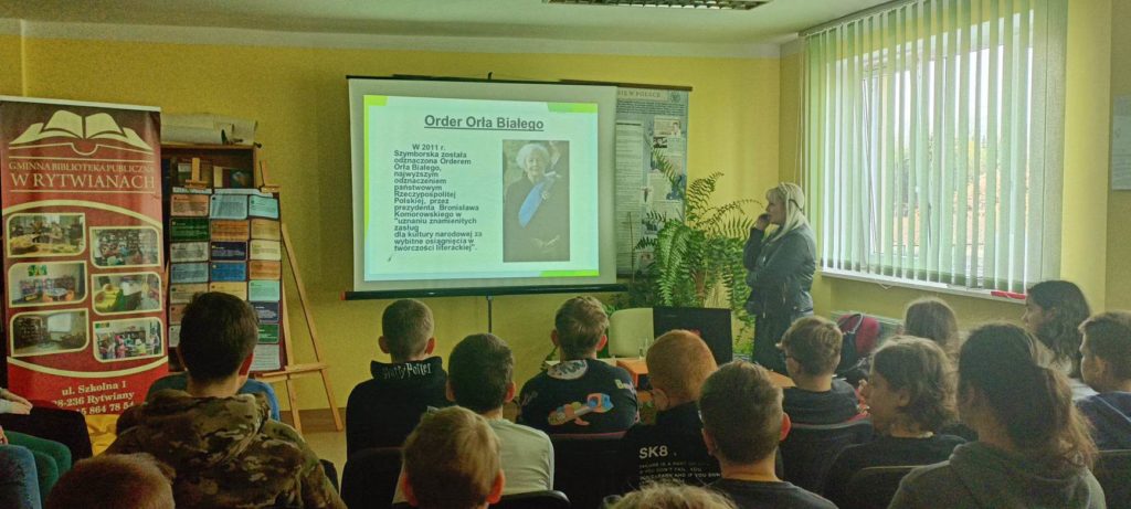 Pierwsze odbyło się spotkanie biograficzno-literackie dotyczące życia i twórczości noblistki, patronki roku 2023 – Wisławy Szymborskiej. Prelekcję urozmaiconą prezentacją multimedialną wygłosiła pisarka Monika Sawicka-Kacprzyk, autorka książek dla dzieci i dorosłych. Pani Monika w nieszablonowy sposób zaprezentowała młodzieży z klasy VII, VI a i VI b wiele ciekawostek na temat Wisławy Szymborskiej. Na koniec spotkania grupa miała do wykonania zadanie (quiz), z którym świetnie sobie poradziła. Na wydarzenie zaprosiła nas Gminna Biblioteka Publiczna w Rytwianach.