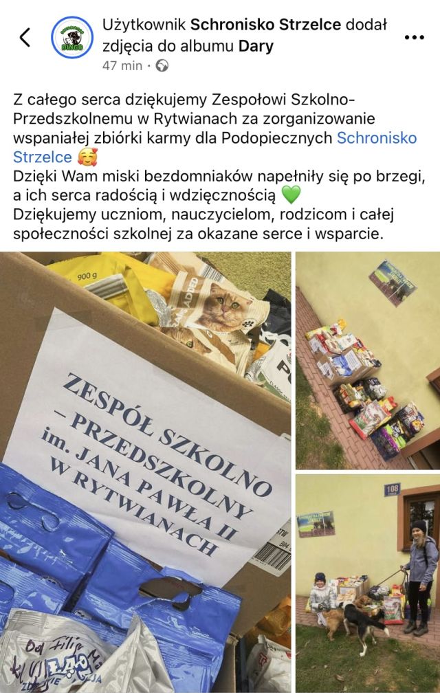 We wrześniu na terenie naszej szkoły odbyła się zbiórka darów dla bezdomnych zwierząt przebywających w Schronisku w Strzelcach.Celem akcji „Paka dla psiaka i kociaka” było przede wszystkim zebranie dla bezdomnych czworonogów potrzebnych rzeczy takich jak: sucha i mokra karma, przysmaki, miski, podkłady higieniczne. To przedsięwzięcie to znakomity przykład na to, że już od najmłodszych lat warto uczyć dzieci przyjaznego stosunku do wszystkich zwierząt: tych, które są w naszych domach, jak i tych, dla których domem jest niestety schronisko.W dniu 5 października wszystkie zebrane dary zostały przekazane czworonogom ze schroniska w Strzelcach.