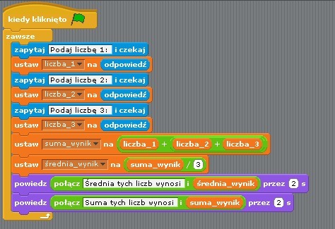Ćwiczenie 1. Wykonaj w programie SCRATCH następujący algorytm obliczający średnią i sumę podanych liczb.