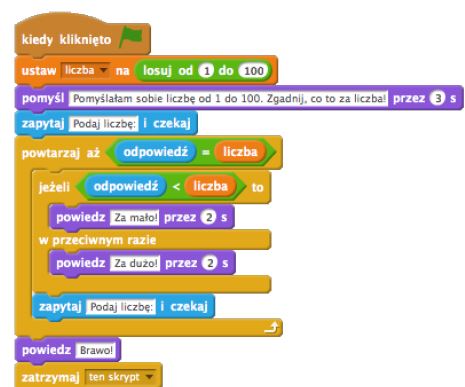 Ćwiczenie 2   Wykonaj w Scratch następujący algorytm – odgadnij jką liczbe wylosował program