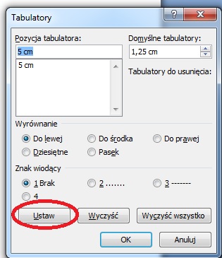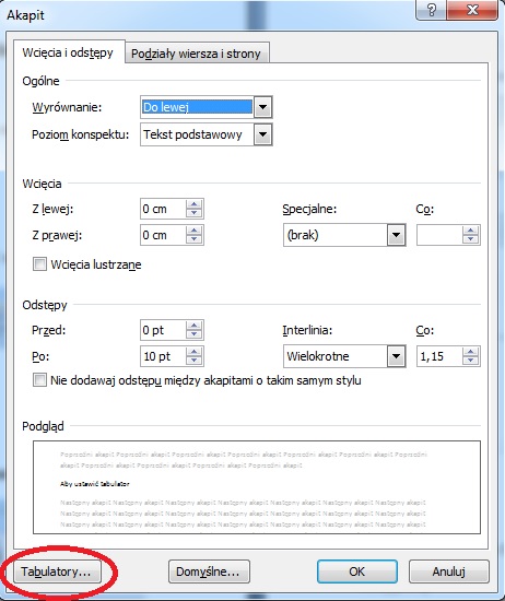 Aby ustawić tabulator klikamy w akapit a następnie tabulatory i wybieramy opcję ustaw