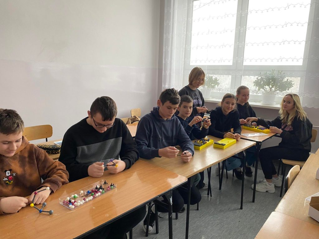 Na lekcjach chemii poświęconej omówieniu zasad zapisywanych wzorów strukturalnych wykorzystano modele chemiczne zakupione w ramach programu Laboratoria Przyszłości . Uczniowie modelowali cząsteczkiprostych związków nieorganicznych. Wykorzystanie modeli przyczyniło się do kształtowania zdolności manualnych , wyobraźni i przestrzennego myślenia.