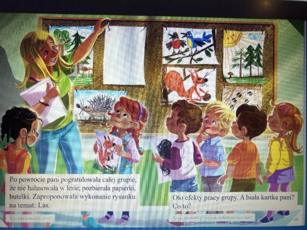 Pani rozdała dzieciom kartki, kredki i farby. Sama też postanowiła coś namalować. Powstały prawdziwe dzieła sztuki: drzewa iglaste oświetlone słońcem, wiewiórka, ślady kopytek, zielona polana i ptaszki na gałęziach. Jacek namalował czarną plamę i oznajmił wszystkim, że to jest nora niedźwiedzia. Ada narysowała lisa trzymającego w łapkach jakiś dziwny przedmiot.