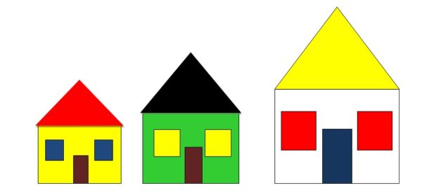 Pomoce: 3 sylwety papierowych domów różnej wielkości.