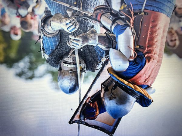 − Jakiej broni używał rycerz? (Broń zaczepną stanowił: miecz, włócznia (kopia), topór oraz sztylet zwany mizerykordią. Broń ochronną stanowiła: tarcza, hełm i zbroja).