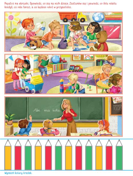 Przyjrzyjcie się obrazkom poniżej. Zastanówcie się i opowiedzcie co Ada robiła kiedyś, co robi teraz, a co będzie robiła w przyszłości.