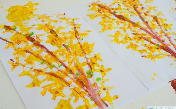 Do wykonania pracy potrzebujecie: białą kartkę format A4, żółtą farbę, brązową farbę, drucik kreatywny lub wycięty szablon kwiatu forsycji.