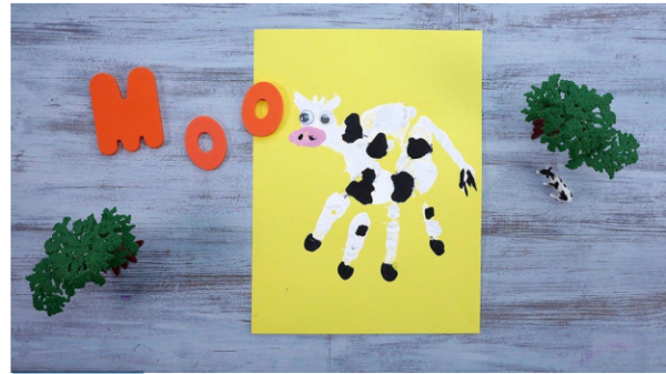 4. Praca plastyczna krowa. Potrzebne będą: – biała, czarna i różowa farba – karta (kolor dowolny) – ruchome oczka (lub po prostu wycięte z papieru) – klej – pędzel