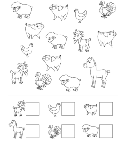 3. Policz zwierzęta na obrazku. W kwadratach poniżej narysuj tyle kresek ile jest zwierząt danego gatunku (np. w kwadracie obok kury narysuj tyle kresek ile jest kur na obrazku). Powiedz, których zwierząt jest najmniej, a których najwięcej. Spróbuj policzyć wszystkie zwierzęta razem.