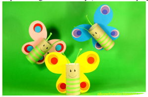 Praca plastyczna: wykonanie barwnego motyla z rolki po papierze toaletowym. Proszę przygotować rolkę po papierze toaletowym oraz kolorowy papier, nożyczki i klej. Rolkę należy okleić paskami kolorowego papieru, następnie pomóżcie dziecku w wycięciu rożków oraz skrzydeł motyla. Następnie ozdóbcie je kolorowymi kółkami, przyklejcie wszystkie elementy, domalujcie oczy i piękny uśmiech.