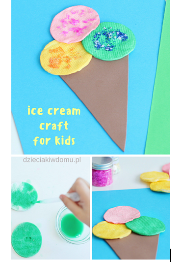 • Praca plastyczna- „Lody”. Potrzebne będą płatki kosmetyczne, kolorowy blok, farby plakatowe, i brokat jeśli jest w domu.