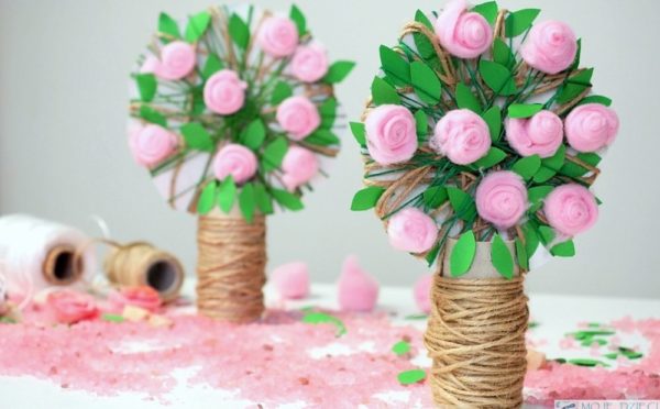 sznurek możemy zastąpić skręconą bibułą, róże z różowych wacików