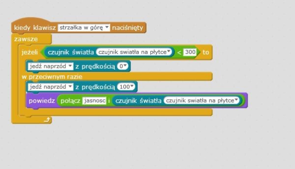 Program dzięki któremu robot w zależności od natężenia światła jedzie lub zatrzymuj się