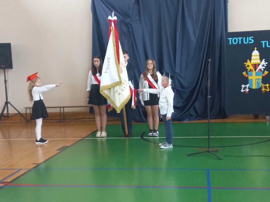Po wprowadzeniu nowego sztandaru szkoły oraz odśpiewaniu hymnu nastąpiło ślubowanie pierwszaków oraz pasowanie na ucznia. Po ślubowaniu Pan Wójt Grzegorz Forkasiewicz wręczył Nagrodę z okazji Dnia Edukacji Narodowej Panu Dyrektorowi oraz złożył życzenia Nauczycielom z okazji ich Święta. Nagrody nauczycielom za szczególne osiągnięcia w minionym roku wręczył również Pan Dyrektor.