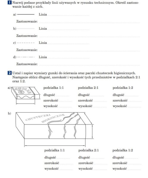 Poniżej umieszczam ćwiczenia do wykonania dotyczące wykorzystania linii w rysunku technicznym oraz SKALI