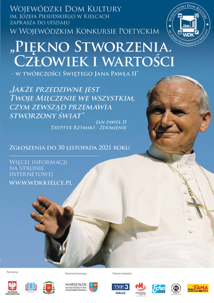 Wojewódzki Dom Kultury w Kielcach i Kuria Diecezjalna w Kielcach Wydział Katechetyczny zapraszają do udziału w Wojewódzkim Konkursie Literackim „Piękno stworzenia. Człowiek i wartości w twórczości Świętego Jana Pawła II”.