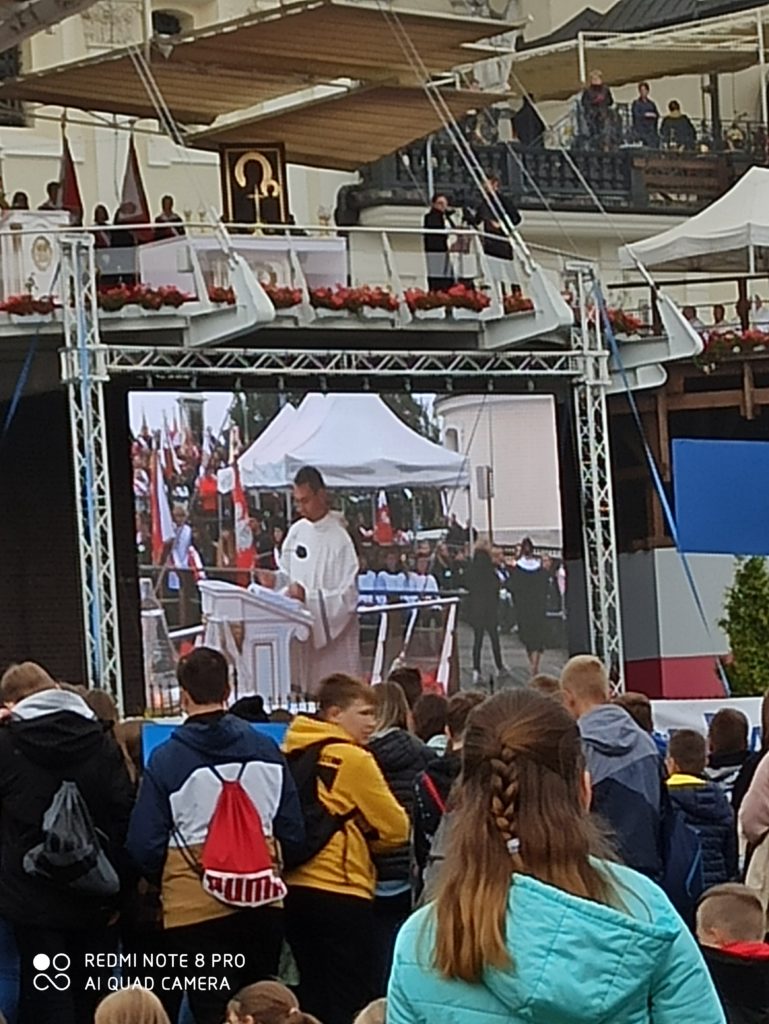 Wyruszyliśmy bardzo wcześnie o godzinie 6.00 . Grupa pielgrzymów liczyła 42 osoby z opiekunami . Pielgrzymowanie rozpoczęliśmy od modlitwy , którą poprowadził Ks. Proboszcz Sławomir Machowski . Na miejsce dotarliśmy około godziny 10.00. Poczet sztandarowy udał się na wały jasnogórskie gdzie co roku ustawiają się poczty przybyłych szkół a pozostali uczestnicy na plac przed Jasną Górą. O godzinie 11.00 rozpoczęła się Msza Święta. Tegoroczne spotkanie włączyło się w narodowe dziękczynienie za kardynała Stefana Wyszyńskiego.